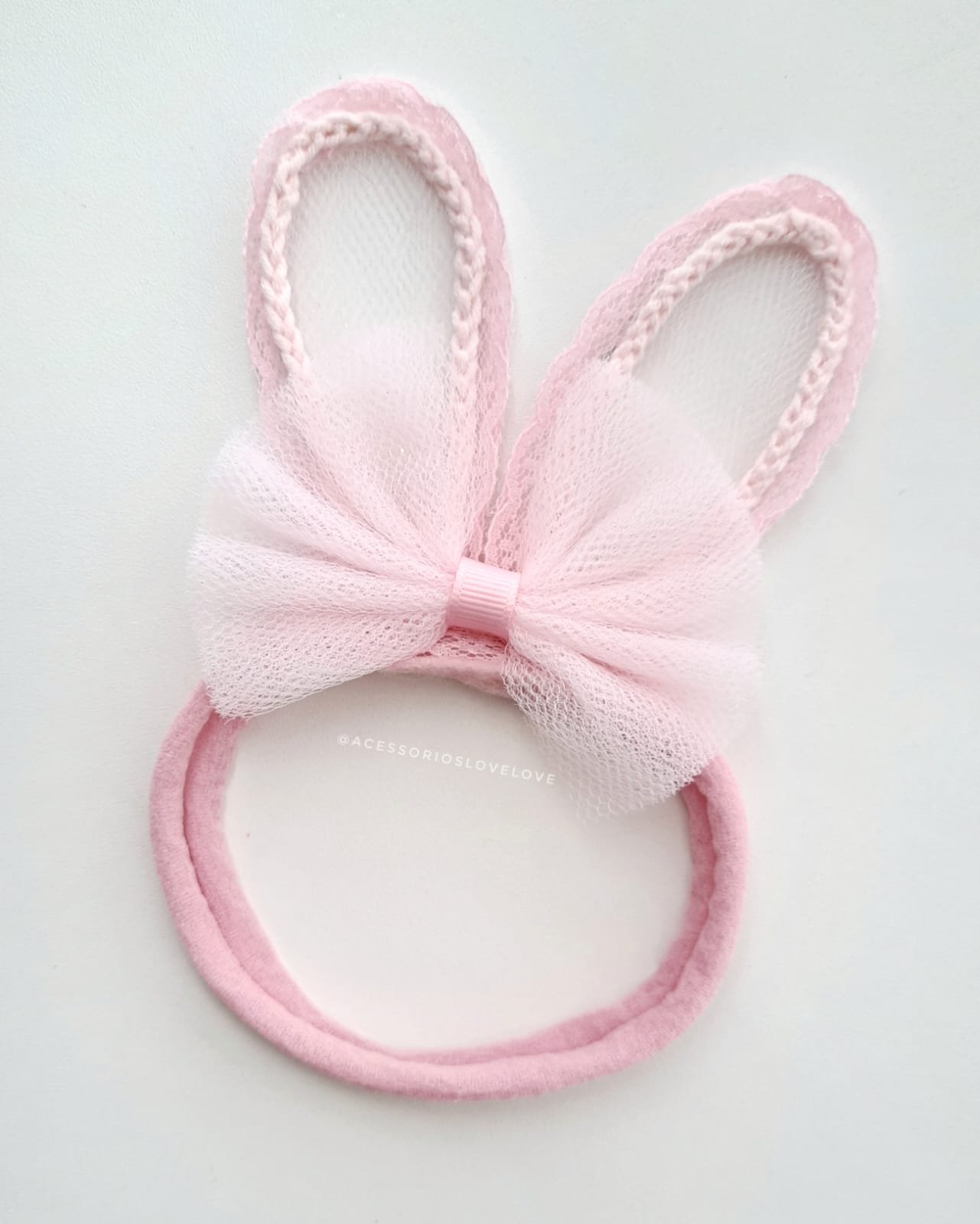 Orelhas de tulê aramadas com bordas de renda rosa. Laço de tulê rosa.