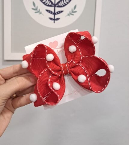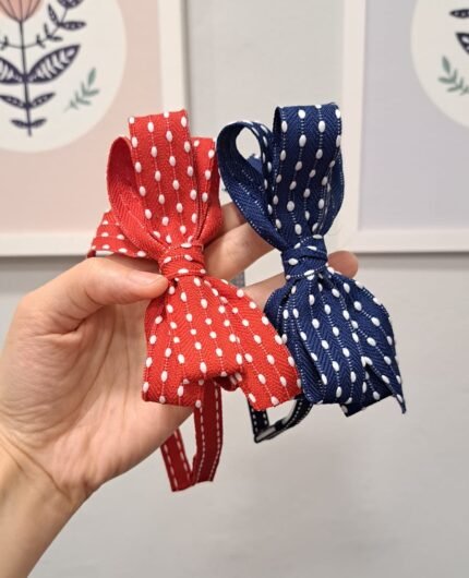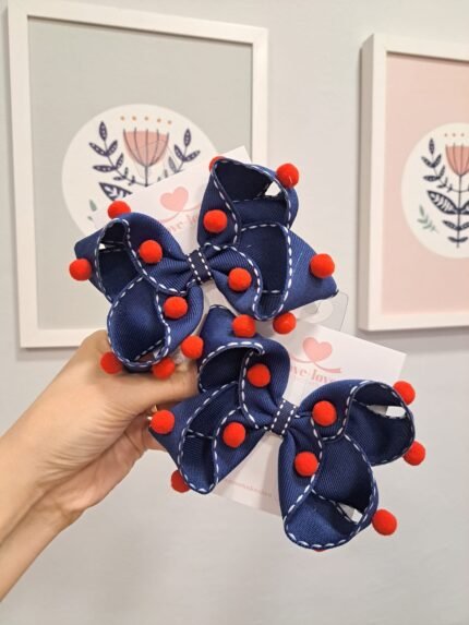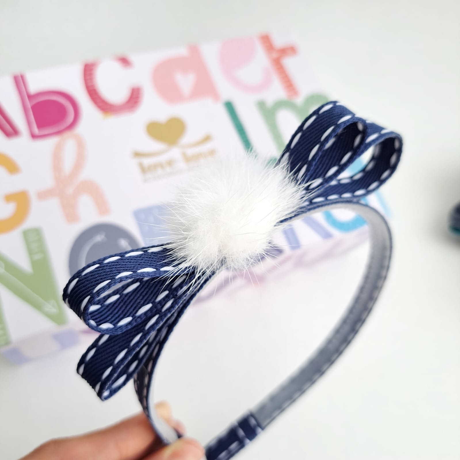 Tiara com laço azul marinho pespontado em branco, medindo aprox 12cm. Pompom de pelúcia branco.